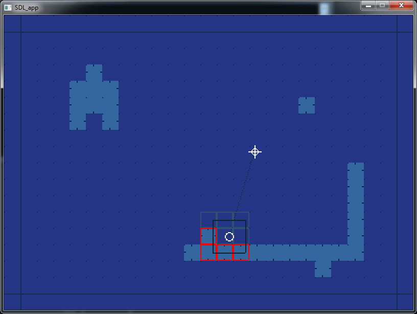 In the continued development of my Ludum Dare game, Ninja Flare, and also future projects I realize that I will most likely follow some form of tile based map representation, just like so many other platform games do. I have therefore been spending one hell of a lot of time trying to find the most robust solution that I can to handle and resolve collisions in a tile map. In many conventional implementations, an object that can collide is limited to be the same size as a single tile in the map, however I want my colliding objects to be of arbitrary size. The problem as I see it is actually not trivial to solve and I have burned through many many pages in my sketch book devising ideas for how to tackle such a problem. I want the most robust solution I can find, although I don’t feel i need to go as far as using swept collision methods, since that would on the face of it add another level of complexity entirely. So far I have created a small framework to let me implement various solvers, and test their robustness. The above picture is a screen shot from this framework, and shows a few things of interest. The very light blue solid rectangles represent walls, or blocking tiles in the map. The dark outlined rectangle in the lower middle is the object that is being tested for a collision and the lighter blue outlined rectangles surrounding it highlight the tiles that were examined when trying to determine an intersection. The outlined red squares that surround some of the tiles highlight any of these that intersect with the object being tested. It is these intersecting tiles that I am interested in when determining how to resolve an overlap.