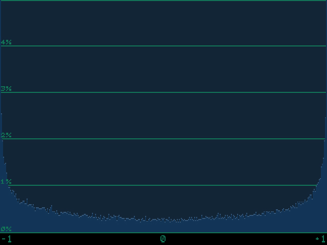 With bowl distribution, it is vastly more probably that the random number will be nearer -1 or +1 rather then 0, and I bet this will come in useful when I want a strong polarity in my randomness. The equation for the bowl distribution was taken and reworked from my sine approximation library and is: