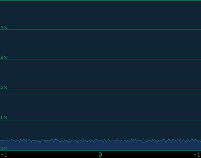 The above image is not the most intuitive thing to look at so let me take a moment to explain it. Here we see the percentage chance that a number generated by the above random number generator will fall into a certain column on the x axis, in this case there are 320 columns; Left most representing -1.0f, middle 0.0f, right most obviously 1.0f. The percentages seen in the graph were constructed after examining the distribution of 60’000 random numbers. Every column here has a value around 0.3%, which is what I would expect, since 100% / 320 = 0.31%. We can infer that there is a nice even probability of all numbers being outputted by this random number generator.