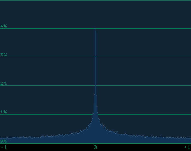 The pinch distribution is actually extremely easy to generate, and is aided by our range being from -1 to +1. If we multiply our random number by the absolute value of itself, then we essentially suck the distribution in around the zero point. The code can be seen below, as well as a some bit-wise hacking to make a floating point value positive.