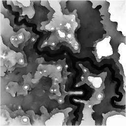I spent my morning programming a small ambient occlusion generator for height maps and the quality of the output is surprisingly nice. In the picture below, 2048 random rays are cast from the center of each pixel out towards the hemisphere. Each pixel represents the ratio between rays that hit other locations of the height maps and those rays that are clear of all other terrain.