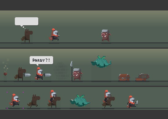 The characters here are just great fun to animate. The dragon is my own design, but the horse, knight and pig are very true to the art of the original. I would love to program a mockup of this one day.